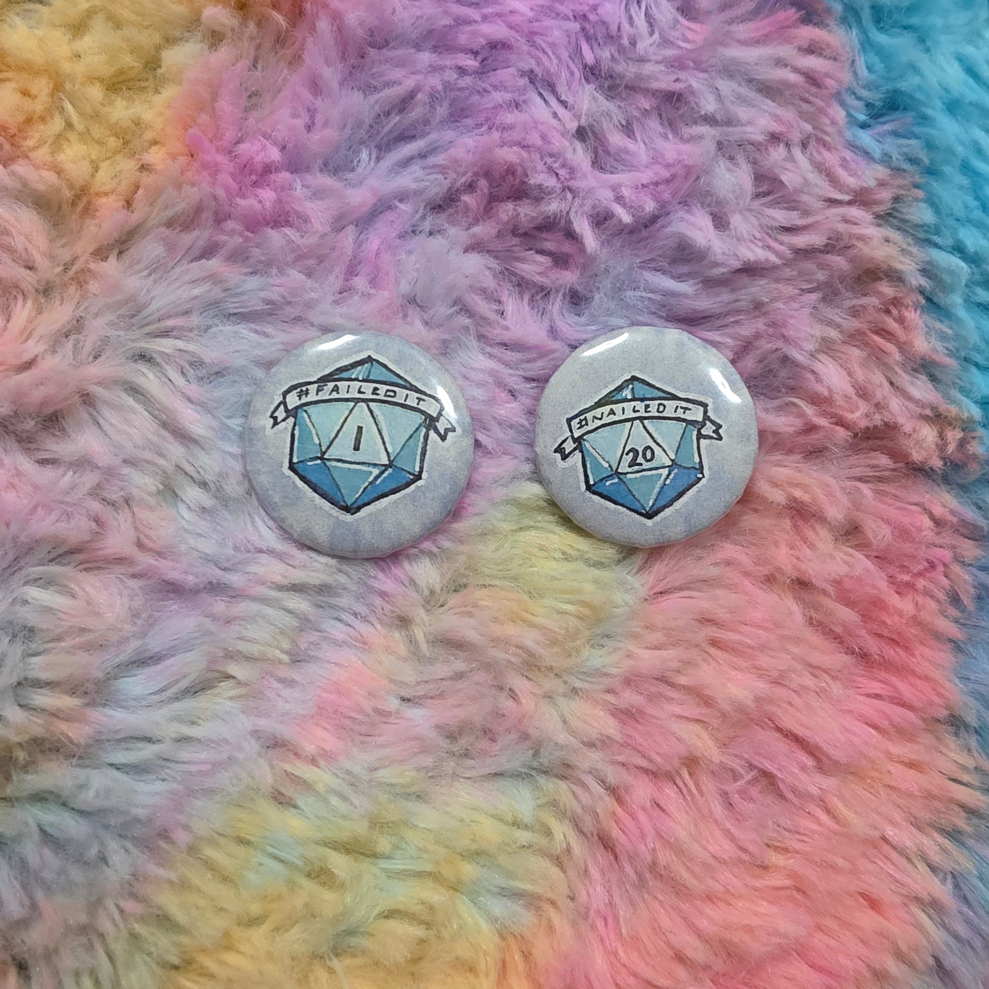 Roll your style with D20 Buttons! Featuring a d20 die with either "nailed it" or "failed it" designs, these buttons make a bold statement. Attach to any garment as a lapel pin for an extra flair. Perfect for gamers and geeks alike. (Critical success not guaranteed.)